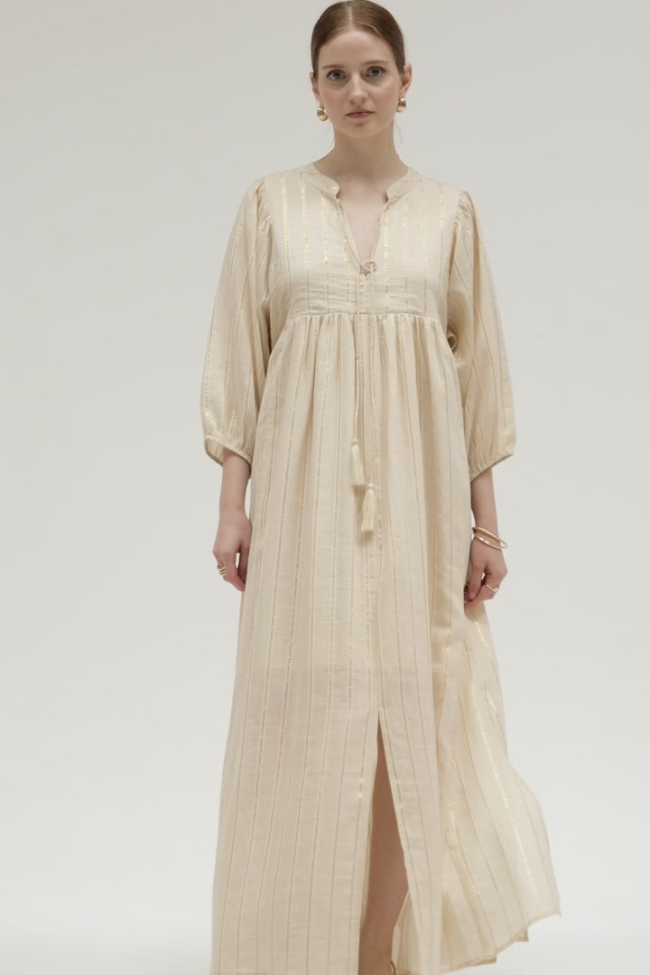 Meet our little gem, Sacha, a maxi dress subtly accented with fine lurex stripes. Its puffed sleeves and tie-front neckline add a bohemian touch, while the loose fit and side slits ensure ease of movement, perfect for sunny days or summer evenings.